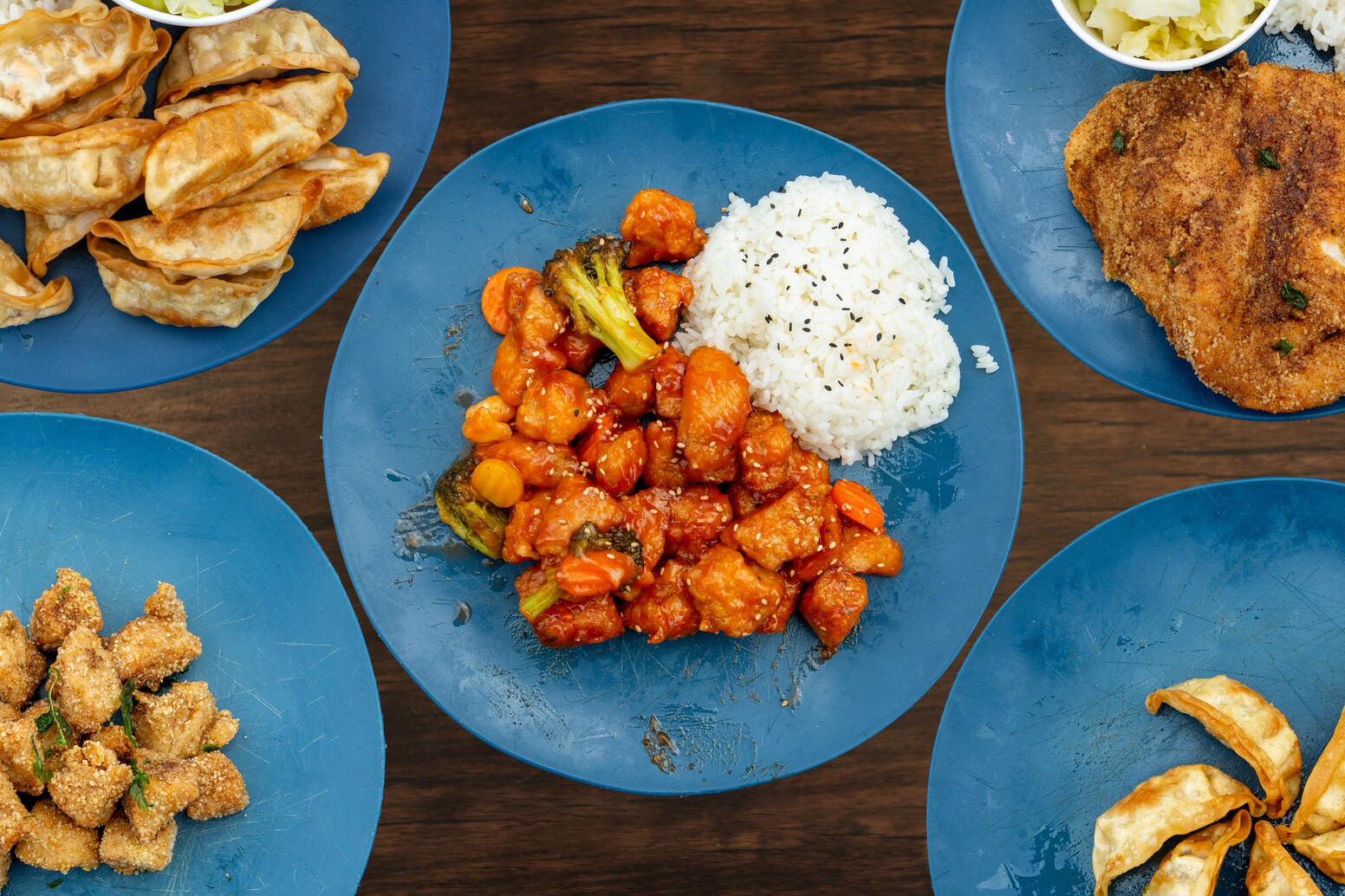 While our breading does not contain gluten, there is a chance there are traces of gluten in the breading flour. Additionally, our chicken is marinated overnight in a marinade that includes soy sauce. The wrapping for the dumplings and eggrolls contain flour. They are all cooked in the same fryer. Consume at your own risk if you are gluten sensitive. Do not consume if celiac.There are no peanuts or peanut oil used in our facilities.Our meat is not certified kosher nor halal meat, however our food otherwise abides by kosher and halal guidelines and rules.There is no shellfish in our facilities or food.We DO use cinnamon in our seasoning.